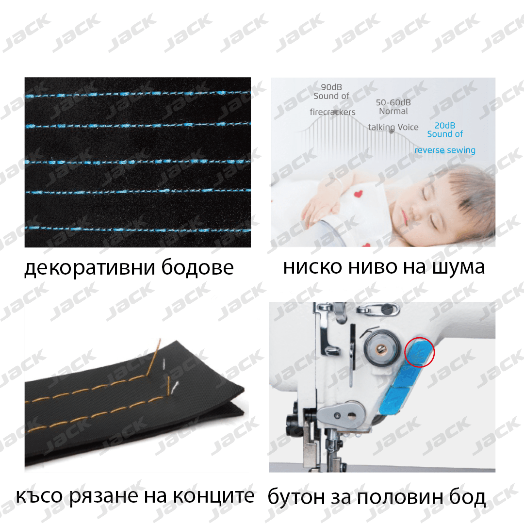 Автоматична едноиглова машина двоен транспорт със стъпков мотор на зъбите. За тежки материи – различни видове кожа, дамаска, тапицерия и др. Електронно регулиране дължината на бода през 0,1мм директно чрез панела. Изключително ниско ниво на шума. Изведени бързи бутони на панела и до крачето за лесен достъп и бърза промяна на параметрите. Запаметени декоративни бодове в паметта на машината с възможност за промяна. Автоматично рязане на конците, вдигане на крачето, автоматични затяжки и позициониране на иглата. Оборудвана с енергоспестяващ мотор, вграден директно в главата на машината (система Direct Drive). Гарантира тиха работа и ниска консумация на енергия. Вградено LED осветление, USB вход, изчистен оперативен панел за лесна промяна и настройка на параметри. Комплект с оригинален плот и стенд JACK на колела. Гаранция 24 месеца